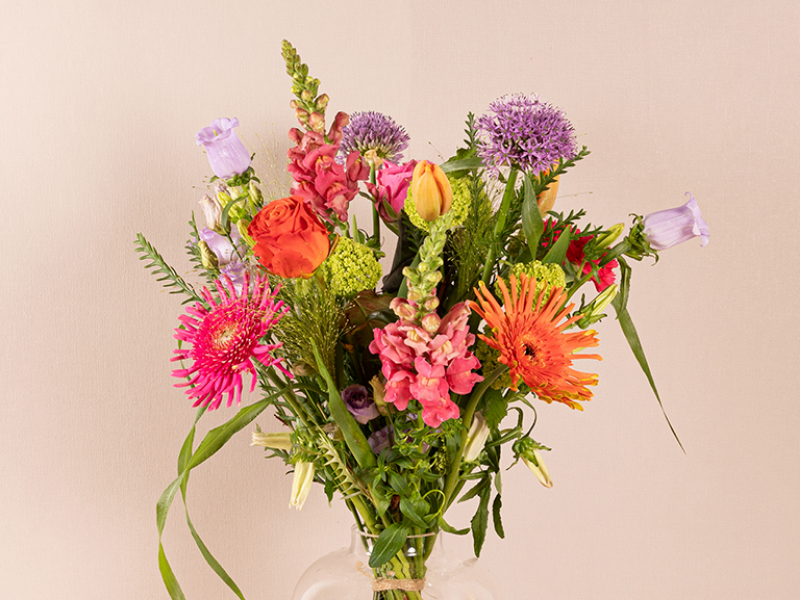 Kleurrijk boeket met warme en levendige accenten, luchtig geschikt met weelderig groen.